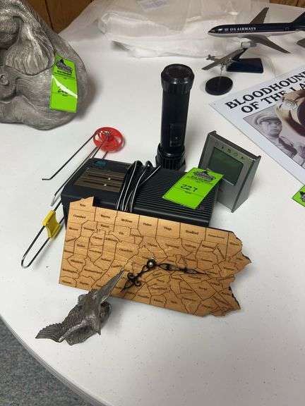 LOT 227 - Clock, flashlight, radio, metal eagle
