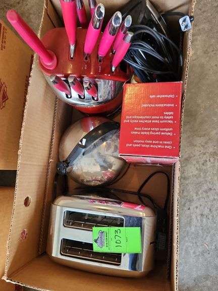 LOT 1073 - Toaster, teapot, knife, set iron, and apple peeler