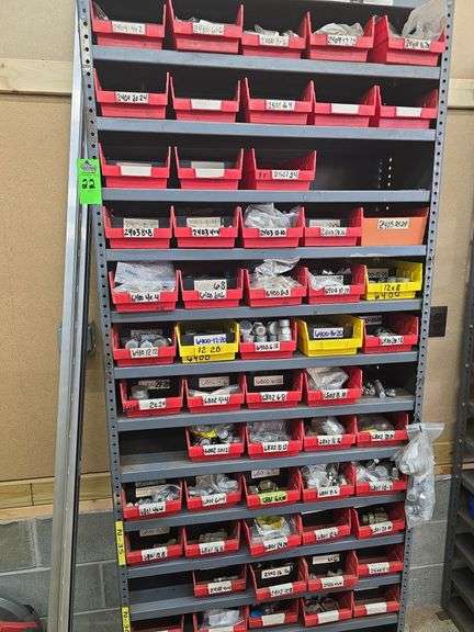 Heavy duty metal shelf with miscellaneous hose fittings and parts