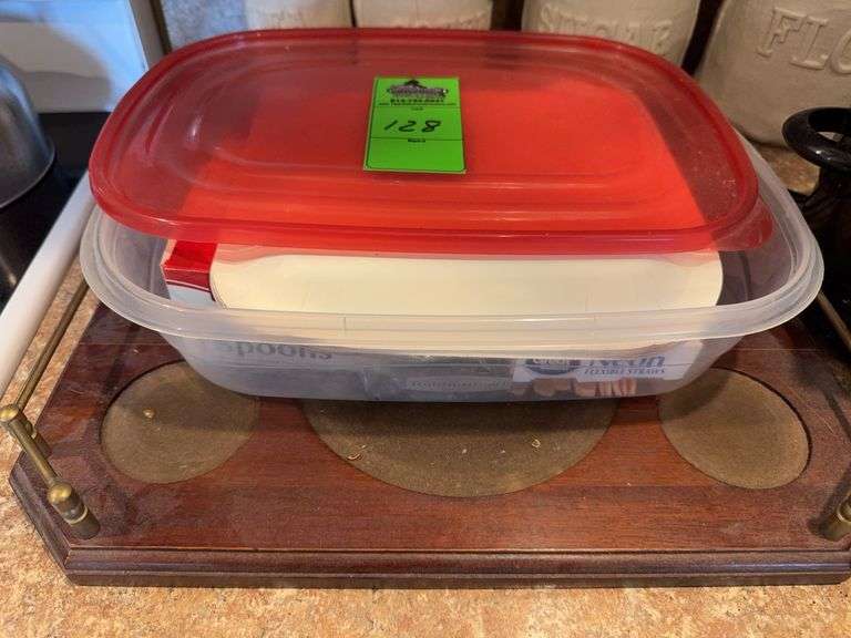 LOT 128 - Plastic storage tub with plastic spoons and straws. Wood serving tray